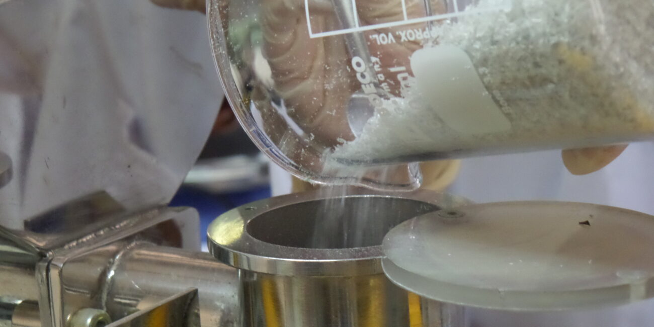 Proceso de mezclado en tolva de extrusora de Tereftalato de Polietileno reciclado PET con nanopartículas semiconductoras con potencial fotocatalítico. Las proporciones se ajustan para lograr una mezcla homogénea.