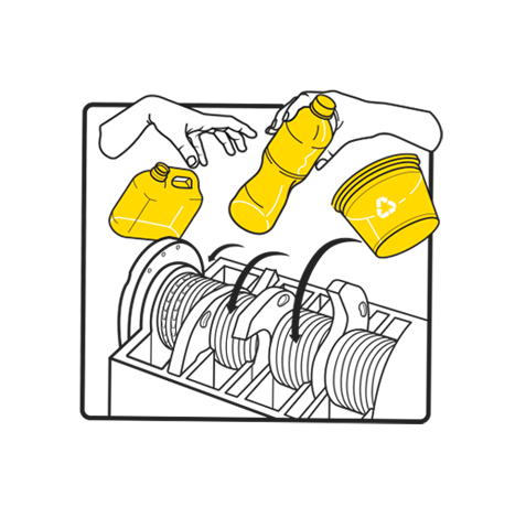 Reducción de los residuos a hojuelas plásticas mediante trituración mecánica.