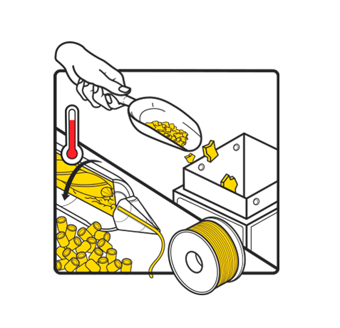 Moldeo del material fundido en pequeños gránulos reutilizables.